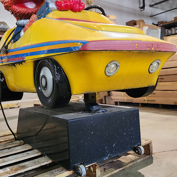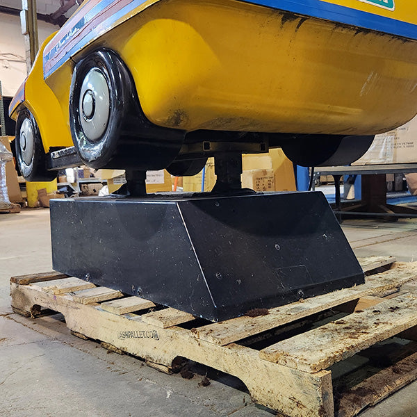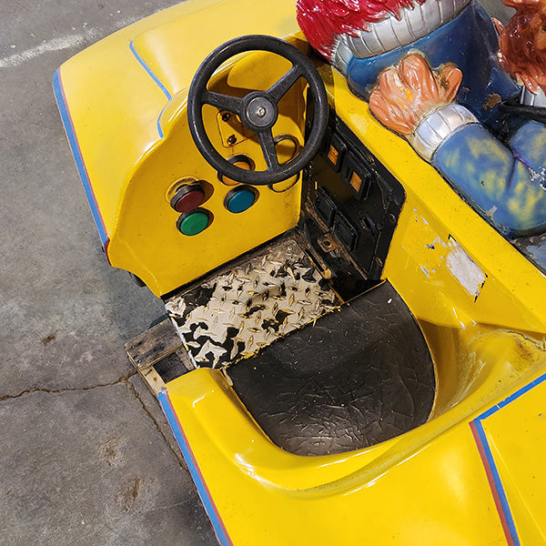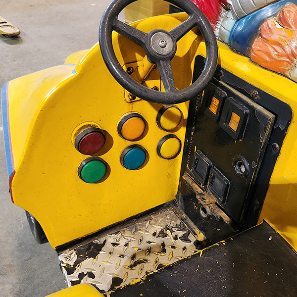 The coin collector and coin box are included with this ride. The status of the control board is unknown. This unit appears to have extra buttons under the steering wheel. These buttons don't exist on other rides. It is unknown how they function. It is assumed the motor is working. The kiddie ride is available as is.