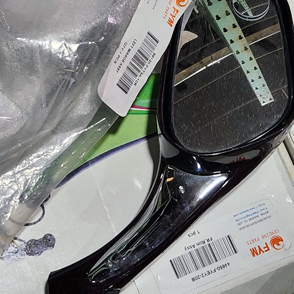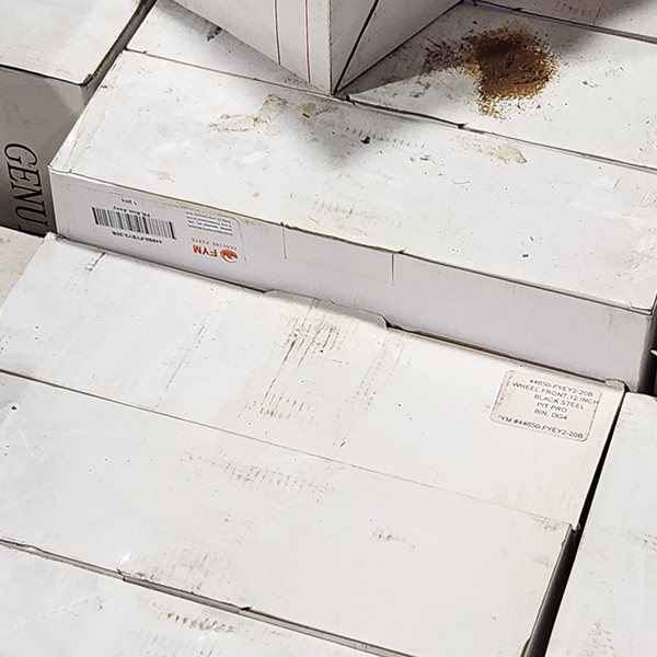 Additional items include loose parts which are included on top of the load. Additional parts include mirrors, wheels and tires not in boxes. These parts appear to be both new and used.
