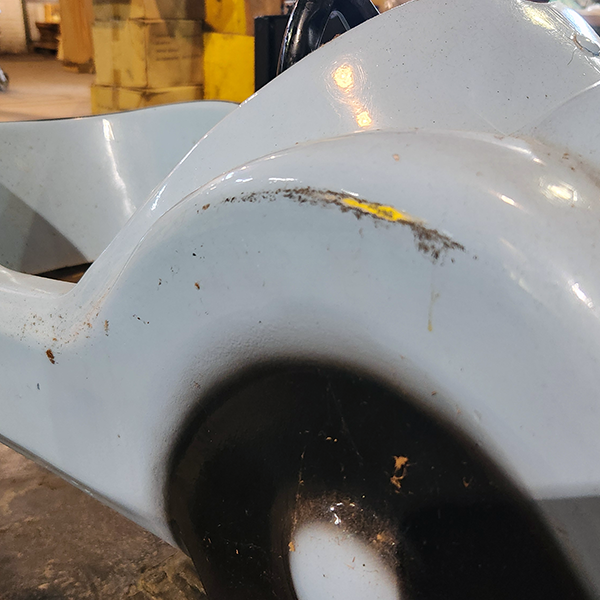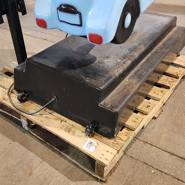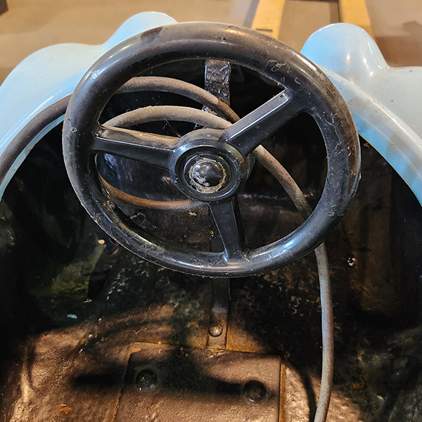 The body of the ride is fiberglass and can be repaired with fiberglass, sanded and repainted. Vinyl, now commonly used to decorate service vehicles, might also be a good option for an updated version of the ride. One image shows some damage on a fender.
