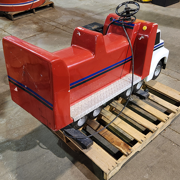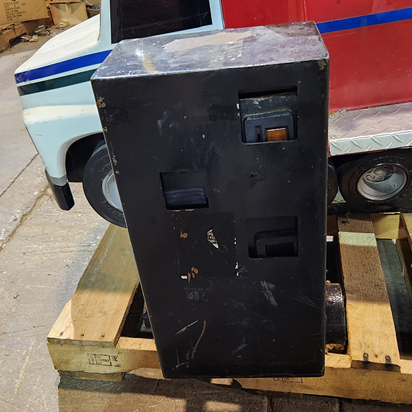 The two seat truck appears have its coin changer and control board, but they have fallen out of alignment in the control stand. Assume they are damaged and not operational. Normally, the coin changer and control board are removed. The coin/control stand appears to be in great shape. It is assumed the motor is working.