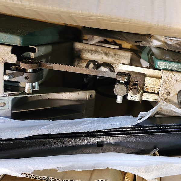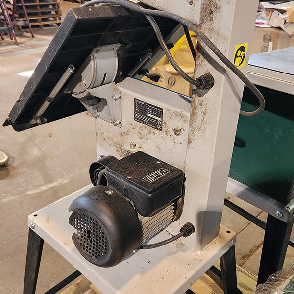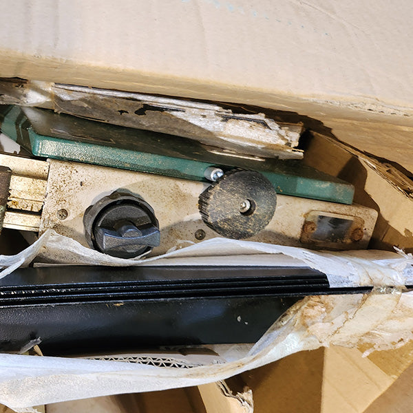 The 9-10" Masterforce bandsaws appear to be operational in various conditions. Two are in boxes. Two are assembled with warped stands. The stands appear to be flimsy. The flimsy stands might be the reason for the return The available fences and platform tools are as shown. Some are missing.