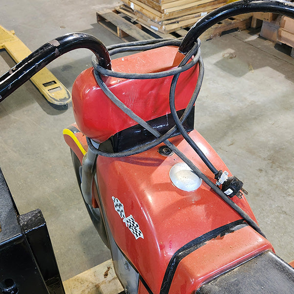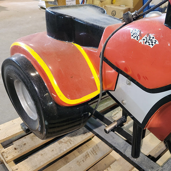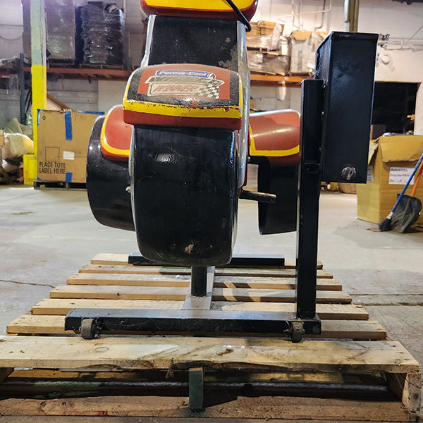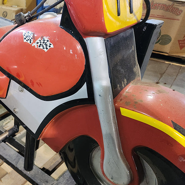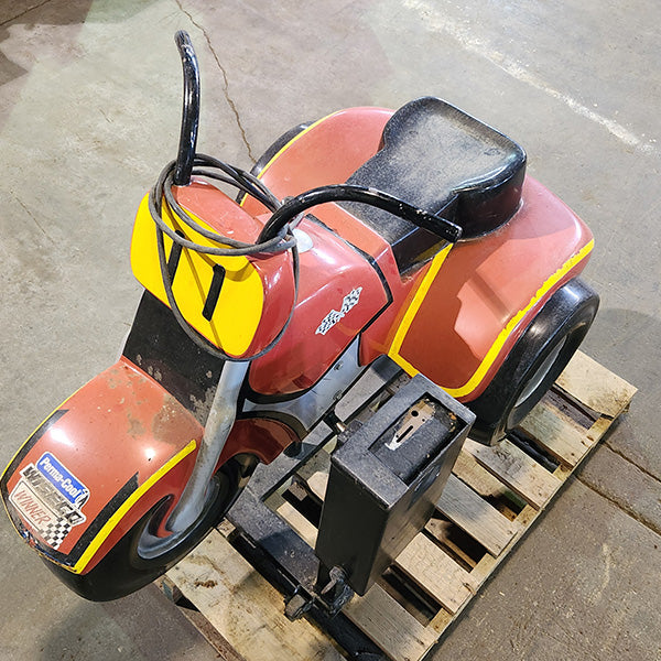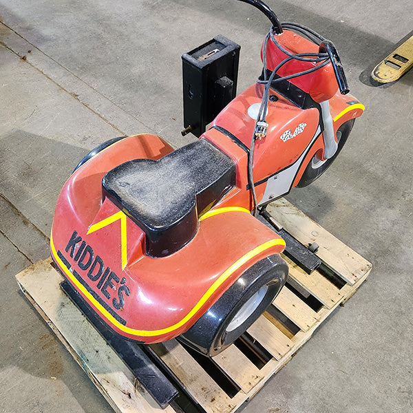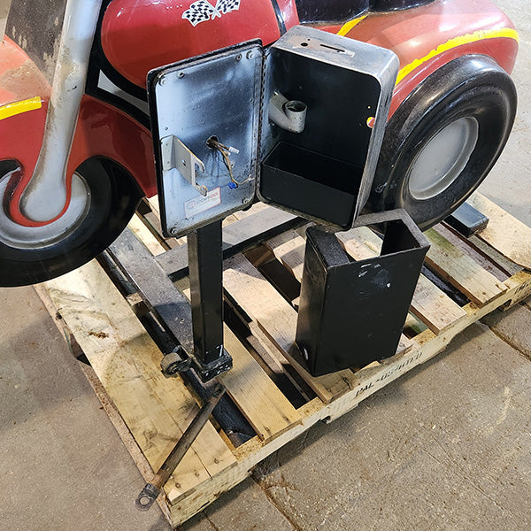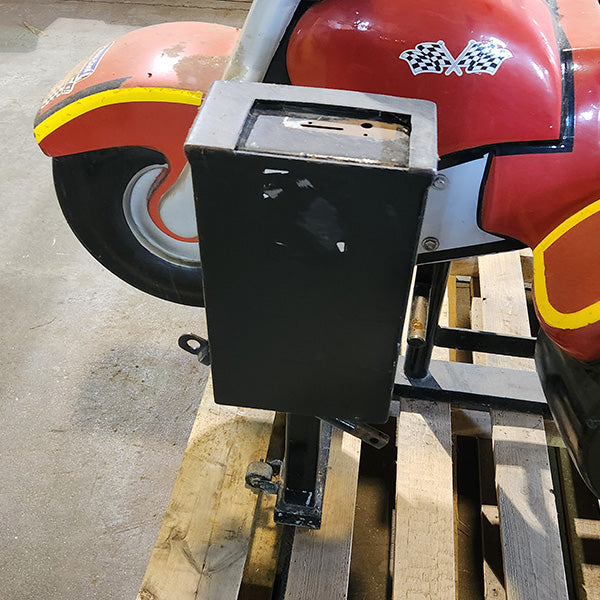 The coin collector and control board are missing for this ride. The coin hopper, coin box cover, and locking pin are included. It is assumed the motor is working. The kiddie ride is available as is.