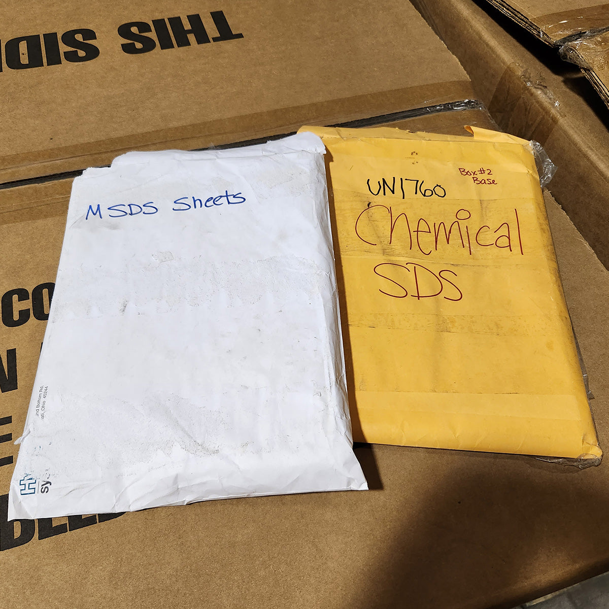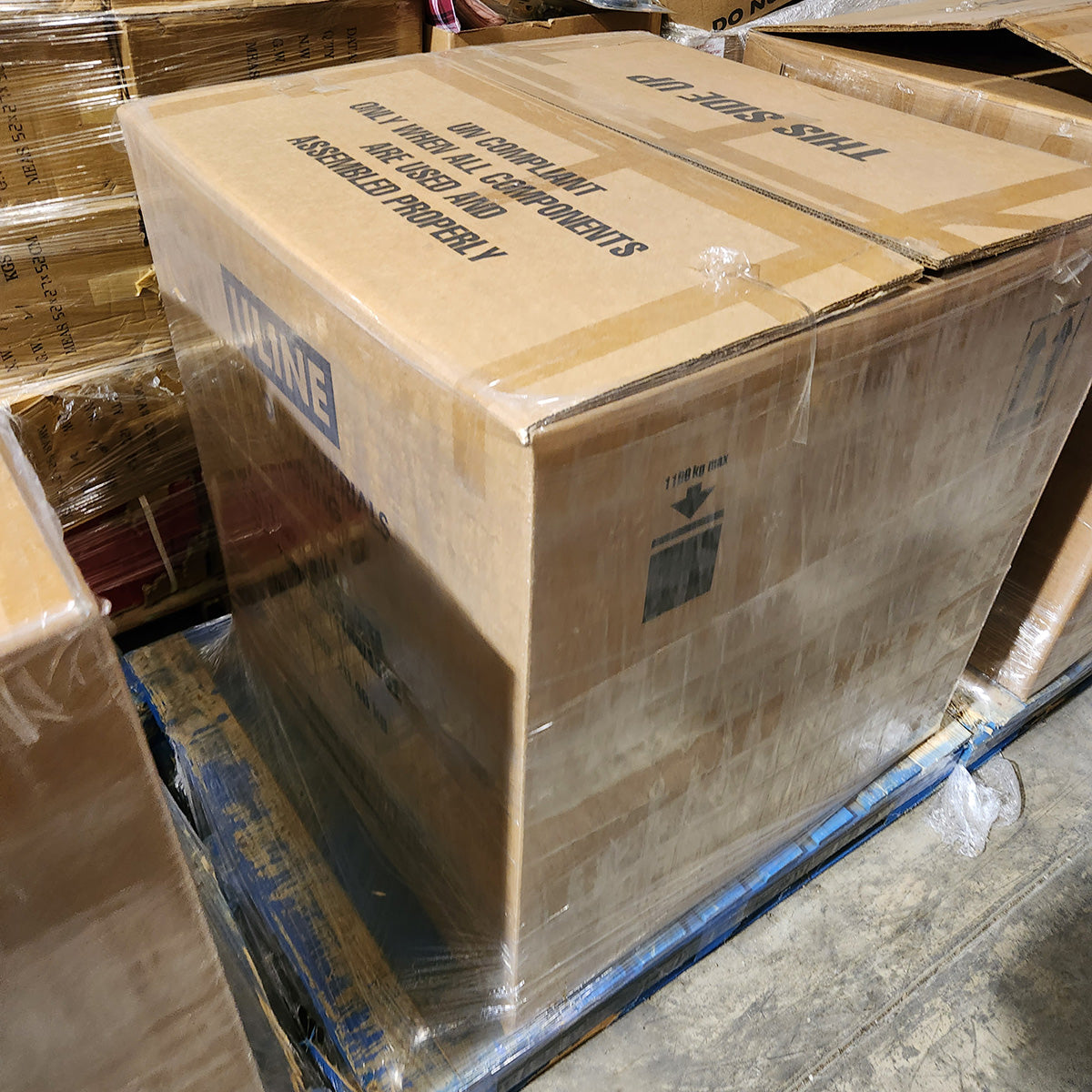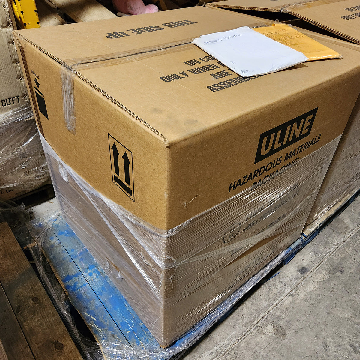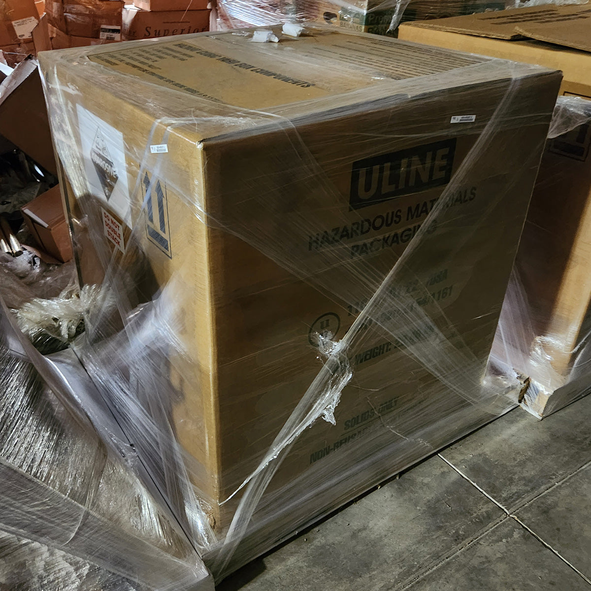 This product contains Hydrochloric Acid. The bowl cleaner ships in new Uline boxes lined with heavy duty plastic. Images of some of the pallets are shown.